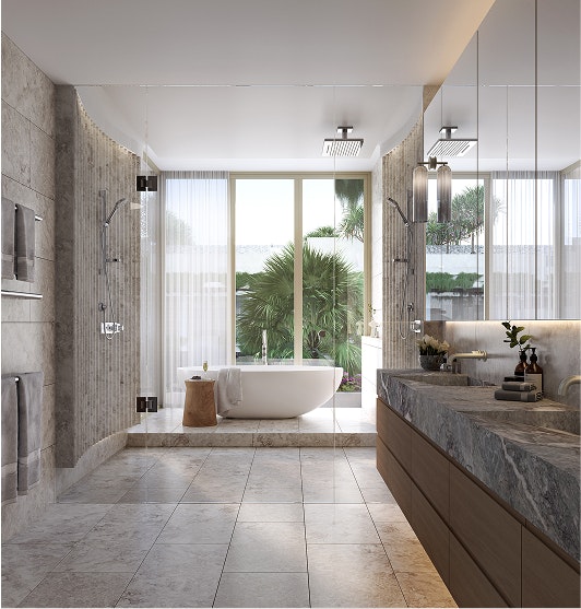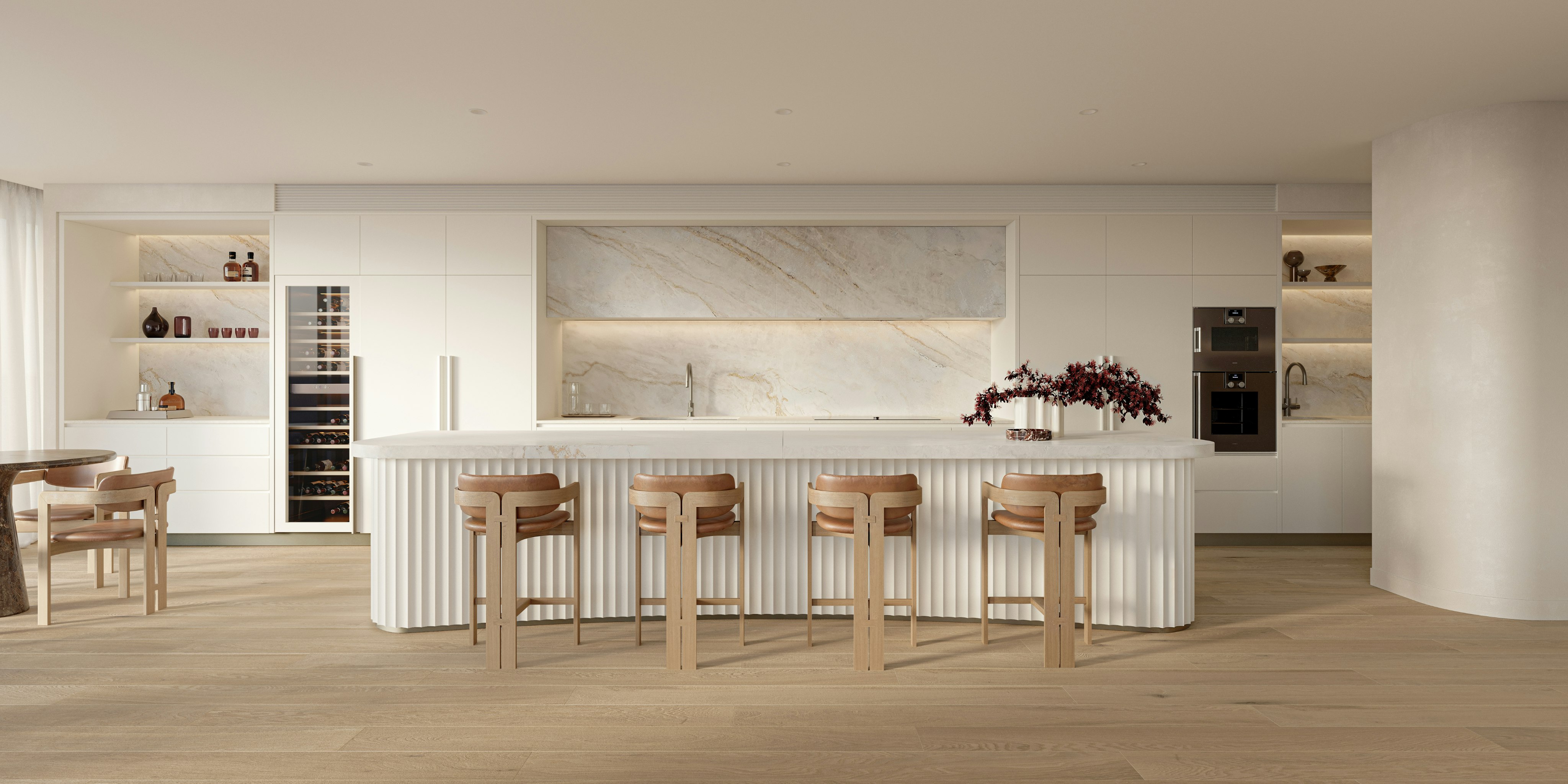 At the heart of each residence is a sculptural kitchen, where form meets function with quiet confidence. A fluted island crowned in natural stone creates a striking centrepiece, while integrated appliances, generous storage and a discreet butler's pantry bring effortless practicality to daily life and entertaining alike.